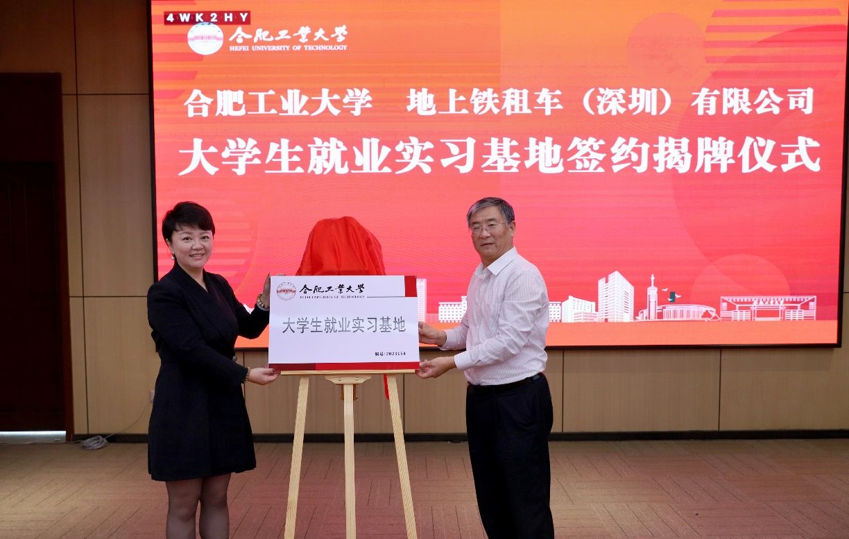活动现场举行了合肥工业大学与地上铁租车(深圳)有限公司共建大学生就业实习基地揭牌仪式。必赢线路检测中心党委书记郭志勇、地上铁租车(深圳)有限公司创始人兼董事长张海莹共同为基地揭牌。