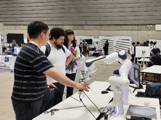 除了携机器人参展以外,李霄剑团队的肖夕林博士和方进博士还受邀进行了分组学术报告。管理科学与工程2019级博士肖夕林受邀在“Motion Control”主题学术报告会上对其参会论文“An Integrated Position-velocity-force Method for Safety-enhanced shared control in Robot-assisted Surgical Cutting”进行汇报。该论文提出了一种增强安全性的人机共享控制方法,通过运动融合机制实现人主导下人与机器人主控权的柔顺切换,并设计了一种力反馈机制以提高安全性。管理科学与工程2022级博士方进受邀在“Medical Robots”主题学术报告会上对其参会论文“A Force-driven and Vision-driven Hybrid Control Method of Autonomous Laparoscope-Holding Robot”进行汇报。该论文提出了一种面向腔镜扶持机器人系统的力觉和视觉混合控制方法,将视觉信息生成的虚拟力矩和触力握把获得的交互力矩进行融合,在远程运动中心约束下实现对腹腔镜视野的引导。两场汇报都受到了在场专家学者的高度关注,多名学者对报告进行了现场提问。