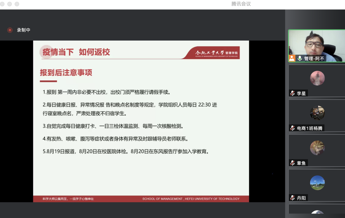 班会上,辅导员带领新生们线上参观“VR校史馆”、浏览校园地图,帮助大家快速了解工大校史校情,尽快熟悉校园环境。随后,阿不老师详细解读了新生报到流程、疫情防控规定,提醒大家及时参加核酸检测、提前规划返校行程、做好个人安全防护。接着,他以“爱心助力梦想,梦想助你飞翔”为题,为学生们讲解了合肥工业大学本科学生资助政策体系,重点阐释了国家助学贷款、新生入学资助项目、绿色通道、困难补助、勤工助学等政策要求。李星老师为学生们梳理了军训准备事宜,并紧紧围绕“谨防电信诈骗,共筑校园安全”,详细讲述了常见的电信诈骗类型及特点,通过案例分析引导学生掌握电信诈骗防范方法,提醒学生们下载“国家反诈中心”APP,牢记“96110”全国反诈电话,增强安全防范意识。最后,两位老师向学生们征集“新生回信”,激励学生珍惜青春时光,保持身心健康,规划四年发展,志存高远,脚踏实地,努力在青春的赛道上跑出当代青年的最好成绩。